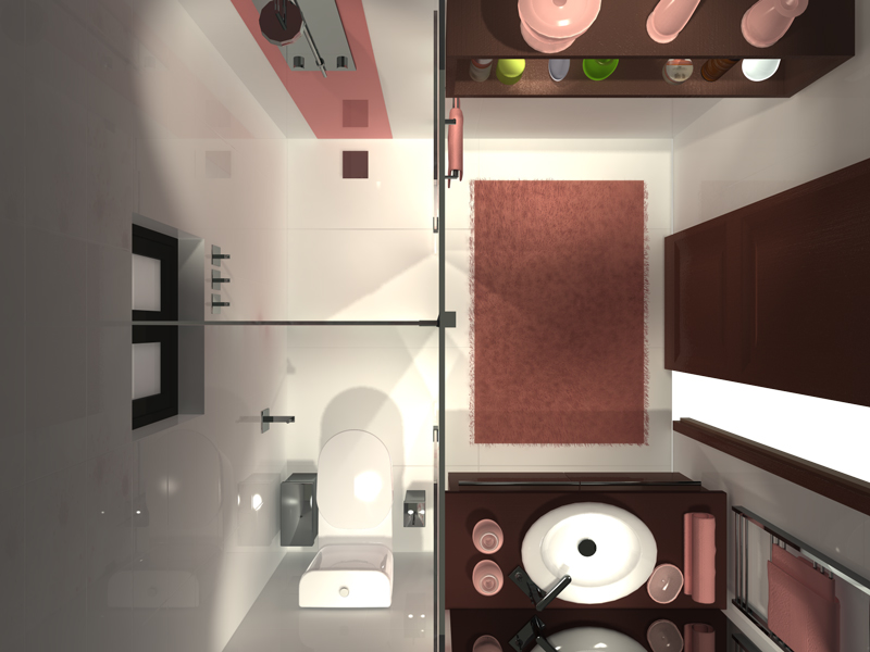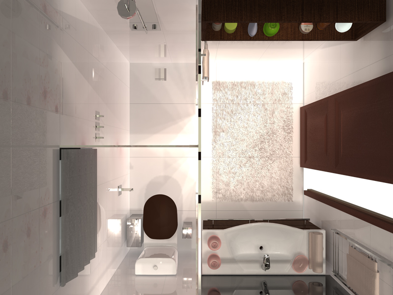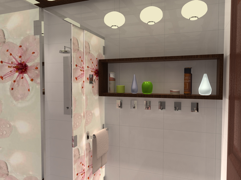 Στο μοναδικό λουτρό του διαμερίσματος, η ντουζιέρα θα αντικαταστήσει την μπανιέρα. Θα υπάρχει δυνατότητα εξυπηρέτησης 2 ή και 3 ατόμων συγχρόνως σε περίπτωση ριζικής ανακαίνισης του λουτρού. Η διακόσμησή του παραμένει να είναι εμπνευσμένη από τη χώρα της ανθισμένης βυσσινιάς, αλλά με ανανεωμένη άποψη.