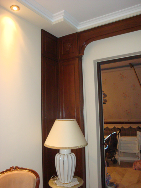 Η ιδιοκτήτρια ζήτησε να σεβαστούμε τα χειροποίητα βαριά έπιπλα και τις ξύλινες επενδύσεις, με τα οποία είναι «προικισμένο» το σαλόνι. Έτσι λοιπόν, τα στοιχεία της ξύλινης διακόσμησης χρησιμοποιήθηκαν ξανά σε καινούριες θέσεις. Τίποτα δεν πήγε χαμένο. Το νέο δωμάτιο θα μπορέσει να φιλοξενήσει ένα με δυο παιδιά.